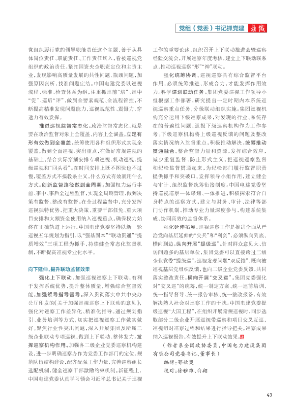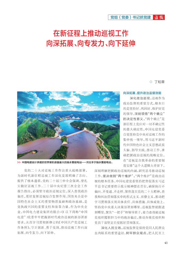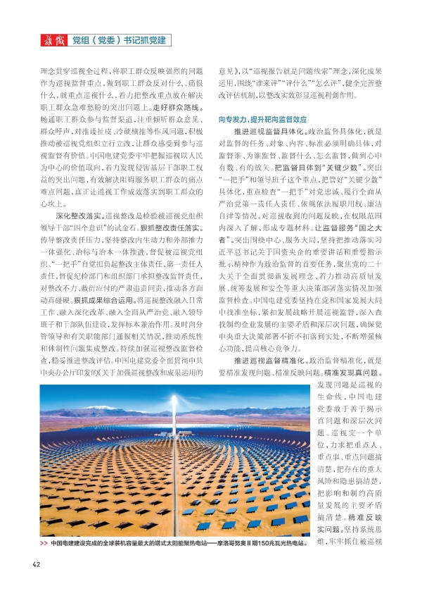 党的二十大对巡视工作作出重大战略部署,为新时代新征程巡视工作深化发展明确了方向、提供了根本遵循。党的二十届三中全会强调,要扎实做好巡视工作。二十届中央纪委三次全会工作报告指出,必须坚守政治巡视定位,深入查找政治偏差,更好发挥巡视综合监督作用。国资央企是中国特色社会主义的重要物质基础和政治基础,是党执政兴国的重要支柱和依靠力量。作为中央企业,中国电力建设集团有限公司(以下简称“中国电建”)党委牢牢把握新时代政治巡视的新部署新要求,认真学习贯彻新修订的《中国共产党巡视工作条例》,守正创新,勇于亮剑,推动巡视工作向深拓展、向专发力、向下延伸。 向深拓展,提升政治监督效能 深化政治巡视。巡视作为政治监督的重要方式,根本目的是坚持好、巩固好、维护好党的领导。深刻领悟“两个确立”的决定性意义。“两个确立”是新征程上党应对一切不确定性的最大确定性,中国电建党委自觉坚持党中央对巡视工作的集中统一领导,用习近平新时代中国特色社会主义思想武装头脑、指导实践、推动工作。准确把握政治巡视的战略定位,在“巡视是自我革命的重要制度安排”这个大逻辑大背景下,深刻理解把握政治巡视的内涵,研究思考推动巡视工作。坚决做到“两个维护”。“两个维护”是政治巡视的根本任务,中国电建党委坚持把督促落实习近平总书记重要指示批示精神摆在首位,确保执行不偏向、不变通、不走样。聚焦落实党的二十大精神,查找和纠治贯彻落实中的形式主义、官僚主义,推动把学习贯彻落实到具体责任、具体措施、具体成效上。坚持党中央重大决策部署到哪里,巡视监督就跟进到哪里,聚焦“一把手”和领导班子,着力查找被巡视党组织履职担当中的政治偏差,推动各级党组织和党员干部坚定自觉抓好贯彻落实。 深化人民立场。巡视监督是保持党同人民群众血肉联系的重要途径。树牢群众观点。把人民至上理念贯穿巡视全过程,将职工群众反映强烈的问题作为巡视监督重点,做到职工群众反对什么、痛恨什么,就重点巡视什么,着力把整改重点放在解决职工群众急难愁盼的突出问题上。走好群众路线。畅通职工群众参与监督渠道,注重倾听群众意见、群众呼声,对推诿扯皮、冷硬横推等作风问题,积极推动被巡视党组织立行立改,让群众感受到参与巡视监督有价值。中国电建党委牢牢把握巡视以人民为中心的价值取向,着力发现侵害基层干部职工权益的突出问题,有效解决阻碍服务职工群众的痛点难点问题,真正让巡视工作成效落实到职工群众的心坎上。 深化整改落实。巡视整改是检验被巡视党组织领导干部“四个意识”的试金石。狠抓整改责任落实。传导整改责任压力,坚持整改内生动力和外部推力一体强化、治标与治本一体推进,督促被巡视党组织、“一把手”自觉担负起整改主体责任、第一责任人责任,督促纪检部门和组织部门承担整改监督责任,对整改不力、敷衍应付的严肃追责问责,推动各方面动真碰硬。狠抓成果综合运用。将巡视整改融入日常工作、融入深化改革、融入全面从严治党、融入领导班子和干部队伍建设中,发挥标本兼治作用。及时向分管领导和有关职能部门通报相关情况,推动系统性和体制性问题集成整改。持续加强巡视整改监督检查,稳妥推进整改评估。中国电建党委全面贯彻中共中央办公厅印发的《关于加强巡视整改和成果运用的意见》,以“巡视报告就是问题线索”理念,深化成果运用,围绕“谁来评”“评什么”“怎么评”,健全完善整改评估机制,以整改实效彰显巡视利剑作用。 向专发力,提升靶向监督效应 推进巡视监督具体化。政治监督具体化,就是对监督的任务、对象、内容、标准必须明确具体,对监督谁、为谁监督、监督什么、怎么监督,做到心中有数、有的放矢。把监督具体到“关键少数”。突出“一把手”和领导班子这个重点,把管好“关键少数”具体化,重点检查“一把手”对党忠诚、履行全面从严治党第一责任人责任、依规依法履职用权、廉洁自律等情况。对巡视收到的问题反映,在权限范围内深入了解,形成专题材料。让监督服务“国之大者”。必须突出围绕中心、服务大局,坚持把推动落实习近平总书记关于国资央企的重要讲话和重要指示批示精神作为政治监督的首要任务,聚焦党的二十大关于全面贯彻新发展理念、着力推动高质量发展、统筹发展和安全等重大决策部署落实情况加强监督检查。中国电建党委坚持在党和国家发展大局中找准坐标,紧扣发展战略开展巡视监督,深入查找制约企业发展的主要矛盾和深层次问题,确保党中央重大决策部署不折不扣落到实处,不断增强核心功能,提高核心竞争力。 推进巡视监督精准化。政治监督精准化,就是要精准发现问题、精准反映问题。精准发现真问题。发现问题是巡视的生命线,中国电建党委敢于善于揭示真问题和深层次问题。巡视完一个单位,力求把重点人、重点事、重点问题搞清楚,把存在的重大风险和隐患搞清楚,把影响和制约高质量发展的主要矛盾搞清楚。精准反映实问题。坚持系统思维,牢牢抓住被巡视党组织履行党的领导职能责任这个主题,善于从具体岗位责任、职能责任、工作责任切入,看被巡视党组织的政治责任。紧扣国资央企职责定位和主责主业,发现影