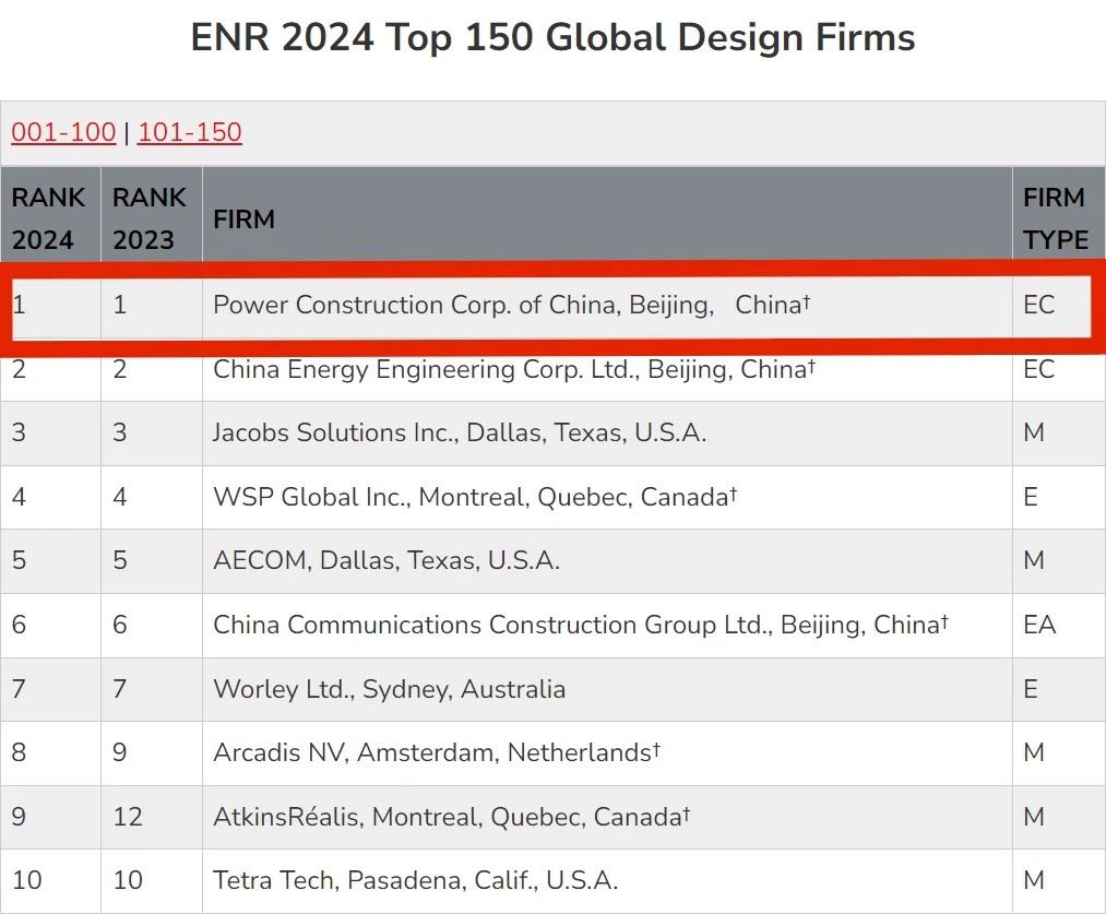 8月29日,美国《工程新闻记录》(ENR)公布了2024年度“全球工程设计公司150强”“国际工程设计公司225强”双榜排名,中国电建分别位列第1位和第15位,连续5年蝉联“全球工程设计公司”榜首,连续10年在双榜单中位列中资企业第1位,继续稳居全球最大设计企业。 ENR是全球工程建设领域的权威学术杂志,其创办的ENR榜单排名在全球建筑业界颇具影响力,是国际承包工程业公认的、较为全面反映年度国际工程市场发展状况的权威排名。 其中,ENR“全球工程设计公司150强”以设计企业的全球营业总收入为排名依据,重在体现设计企业的综合实力;“国际工程设计公司225强”排名则依据设计企业在本土以外的海外工程业务总收入,重在体现设计企业的国际业务拓展实力。 中国电建是全球清洁低碳能源、水资源与环境建设的引领者,全球基础设施互联互通的骨干力量,服务“一带一路”建设的龙头企业,现有中国工程院院士1人、全国工程勘察设计大师5人;拥有国家级研发机构10个、省部级研发平台118个、院士工作站9个、博士后工作站11个。根据国家有关部委安排,承担相关领域战略规划、政策研究、标准制定等工作。多年来为世界各国、全球客户交付了一系列代表行业领先水平、令世人瞩目的精品工程。 作为全球工程设计企业的翘楚,中国电建具有政府信赖的国家能源战略服务能力和国际领先的高端技术服务能力,承担了国内80%以上河流及水电站的规划设计任务、65%以上的风力发电及太阳能发电工程的规划设计任务,形成了能够代表国家综合实力的水电、抽水蓄能、新能源等清洁可再生能源领域完备的技术服务体系、技术标准体系和科技创新体系。 |
