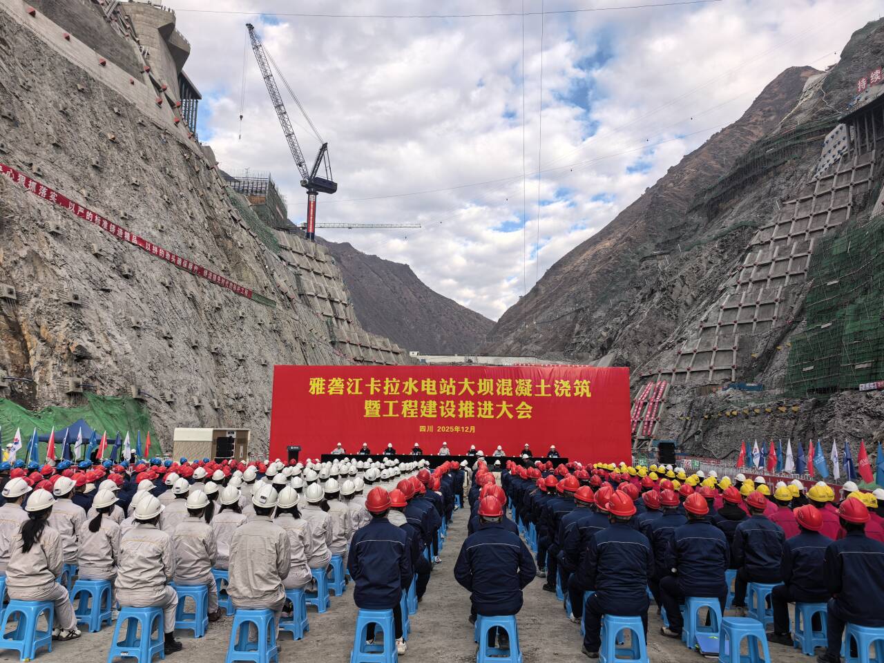 12月30日,雅砻江卡拉水电站大坝混凝土浇筑暨工程建设推进大会顺利召开,水电七局参建的雅砻江卡拉水电站大坝首仓碾压混凝土开始浇筑,标志电站从基坑开挖阶段正式转为大坝混凝土浇筑阶段。 卡拉水电站位于四川省凉山彝族自治州木里藏族自治县境内,是雅砻江中游河段第七级水电站,是国内首个全周期采用EPC模式的百万千瓦级水电站,国家“十四五”规划能源领域重点项目,西南清洁能源基地建设关键工程,更是优化区域能源结构、助力“双碳”目标实现的重要支撑。开发任务为发电,电站总装机容量1020兆瓦,水库正常蓄水位1987米,死水位1982米,正常蓄水位以下库容2.378亿立方米,调节库容0.365亿立方米。枢纽主要建筑物由挡水建筑物、泄洪消能建筑物及引水发电系统等组成。挡水建筑物采用碾压混凝土重力坝,最大坝高123米。 卡拉水电站工程开挖、混凝土浇筑等环节深度应用数字化、信息化、智能化技术,构建国内水电行业首个全业务、全流程、全要素智能建设平台,打造继锦屏、杨房沟水电站之后的大型水电EPC建设管理3.0版本。具备“一高四多”的复杂特性,在基坑开挖阶段面临地质状况复杂、基坑渗水量大等诸多挑战。“E心筑坝”攻坚小组与党员突击队积极开展技术攻关,针对复杂的地质条件优化施工方案,采用“分层开挖、随层支护”的作业模式,借助智能建设平台,运用数字化、智能化等多种技术强化施工管理手段。在左右岸坝肩及左岸危岩体开展锚杆智能灌浆、锚索智能灌浆、锚索智能张拉试验,有效控制边坡稳定性,比合同工期提前3个月完成大坝基坑开挖任务,为提前实现卡拉水电站大坝及泄洪消能系统成功转序奠定坚实基础。 电站投产后,年平均发电量约46.5亿度,相当于每年可节约标煤140万吨,减少排放二氧化碳320万吨。同时,其具有的发电量大、电能质量优越、丰枯出力均衡的特点将对改善四川电网枯期水电出力不足、优化四川电网电源结构具有重要意义。 |
