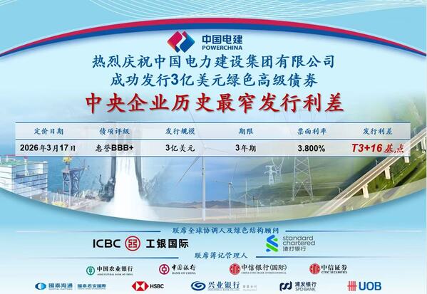 3月17日,公司在香港联交所成功发行3年期3亿美元高级绿色债券,发行票息3.8%,发行利差T+16bps,创下中央企业境外债券发行史上最窄利差纪录,成为2026年首单央企境外绿色债券,彰显了公司在国际资本市场的强劲竞争力与良好口碑。 本次发行由公司党委常委、总会计师杨良亲自带队统筹推进,全程精准部署、高效联动。期间,团队成功举办高质量投资者沟通会、与工银国际、建银亚洲等机构深入会谈,并开展全球交易路演,面向国际投资者深度宣讲集团战略、经营成效、信用实力与绿色发展蓝图,路演推介成效显著。 本次债券发行获得国际资本市场踊跃认购,账簿峰值认购倍数接近8倍,投资者结构优质多元,覆盖港澳、新加坡及欧洲等核心市场,充分体现了全球资本对中国电建信用水平与发展前景的坚定信心。此次境外债券的成功发行将进一步提升公司国际资本市场形象,为公司海外投融资业务高质量发展和“十五五”规划良好开局提供有力支撑。 路演期间,杨良还专程前往电建海投香港公司调研,并亲切慰问一线员工。他围绕电建海投香港公司下一步高质量发展提出六点要求:一是持续强化投资质量管控,筑牢发展根基;二是依托香港区域优势统筹全球资金资源,更好服务集团海外投资及各子企业发展;三是加强与集团境外财资中心业务联动,实现资源共享、协同发展;四是聚焦国家战略,深化人民币国际化相关研究与实践;五是紧跟金融科技发展趋势,推进法定数字货币、区块链等技术应用,提升国际结算效率、降低运营成本、盘活存量资产;六是加强国际化人才队伍建设,为青年人才搭建广阔平台。 公司财务金融部、海外事业部、电建海投公司相关负责人参与本次债券发行及调研。 |