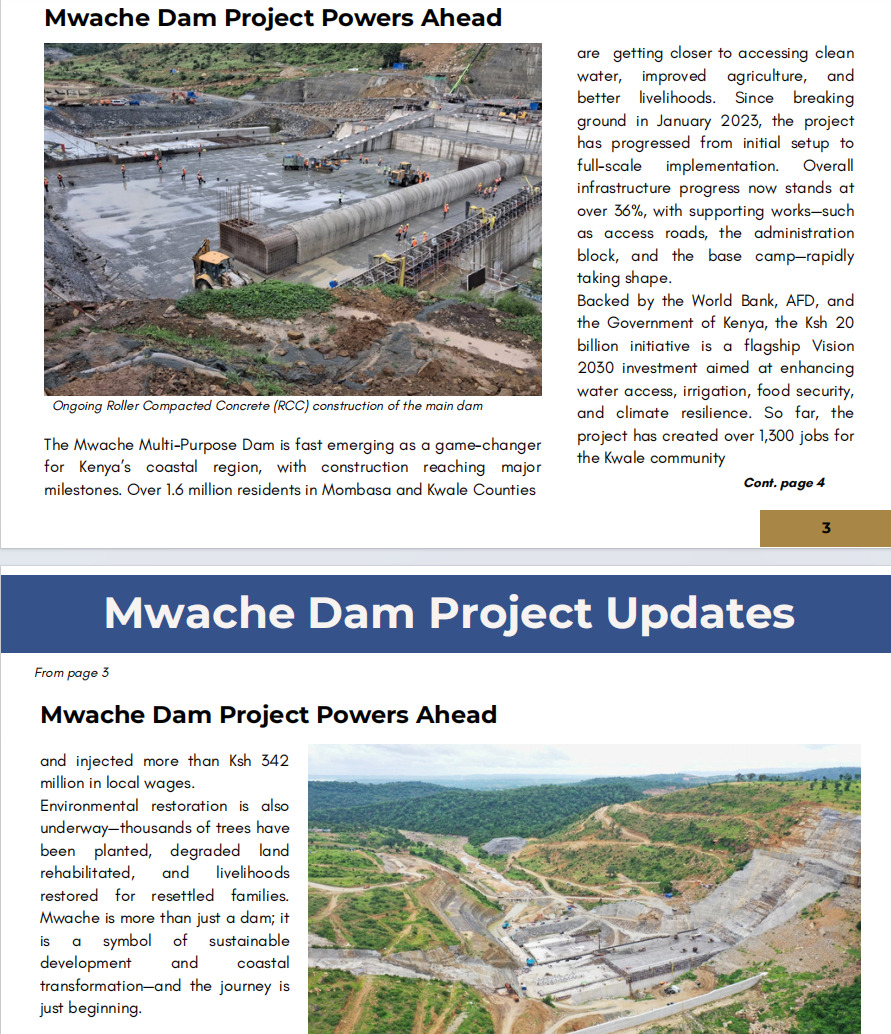 近日,肯尼亚水利部发布《Kenya Water Security and Climate Resilience Project(肯尼亚水资源安全与气候适应力项目)》宣传画册,画册以《穆瓦驰多用途大坝项目稳步推进》为题对公司承建的穆瓦驰大坝项目进行了专题报道。 报道指出,自2023年1月开工以来,穆瓦驰大坝项目建设稳步推进,目前基础设施完成进度已超过40%,进场道路、行政办公楼及营地等配套工程正加快成型。大坝主体碾压混凝土施工持续进行,工程整体取得显著进展。 项目实施后,当地居民将获得清洁水源、改善农业条件并提升生活质量。项目已为夸莱社区创造1300多个就业岗位,累计发放工资逾3.42亿先令,有力促进了当地经济发展。 同时,项目注重生态修复,已种植数千棵树木、恢复退化土地,为移民家庭再造家园。穆瓦驰不仅是一座大坝,更是肯尼亚沿海地区可持续发展与社会转型的象征。 此前,肯尼亚水利部向项目发来表扬信,信中充分肯定了项目部在环境、社会、健康与安全(ESHS)管理方面所取得的优异成绩。 此次报道不仅体现了肯尼亚政府对公司履约能力与管理水平的高度认可,也佐证了公司在ESHS领域的专业实力,为后续拓展海外市场、提升品牌形象奠定了坚实基础。 |