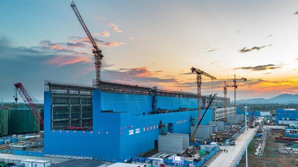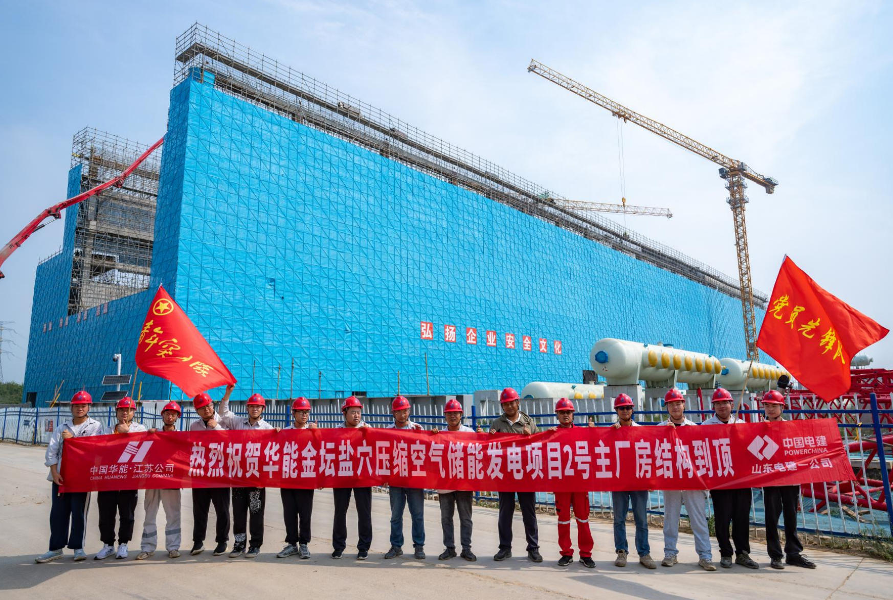 金秋时节,稻穗飘香,攻坚正酣。在江苏常州茅山脚下,空中俯瞰,一处源自金坛地下千米盐穴而建设的规模宏大的能源新地标正在崛起,施工现场塔吊林立、车辆穿梭、一派热火朝天。 由山东电建一公司承建的世界最大压缩空气储能电站——华能金坛2×350兆瓦盐穴压缩空气储能发电项目2号机组正茁壮成长,接连实现工程节点,呈现出一幅生机盎然的壮观景象,当前项目团队正抢抓黄金施工期,以实干担当建设好这一超级绿色“空气充电宝”,用一项项扎实的工程进展向国庆献礼。 主厂房结构封顶、行车梁安装就位 日前,随着2号主厂房最后一方混凝土浇筑完成,标志着本项目长度达178米、跨度37米的最大混凝土单体建筑主体结构顺利到顶,为后续设备安装、封闭断水及整体工程推进奠定了坚实基础。 山东电建一公司华能金坛项目部自主厂房基础出零米以来,围绕节点目标,精心组织、周密部署,科学统筹各类资源,克服了图纸滞后、极端天气、场地狭小、施工难度大等的诸多挑战,倒排进度计划,挂图作战、协调调度,优化施工工序、方案和作业时间,党员先锋队、青年突击队和施工班组全力以赴攻坚克难,仅历时5个月,安全高效完成从基础施工到主体结构封顶的全过程。 紧接着,主厂房内首段行车梁实现一次性精准吊装就位,后续梁段依次吊装排列到位,2台行车安装的“咽喉”工序被打通,为接下来空气压缩机、透平膨胀发电机组等核心大件设备的“登场”吊装创造了决定性条件。 核心设备基座浇筑、工程实体快速推进 该项目将研制安装世界最先进的空气透平膨胀机和压缩机组,并实现核心设备的100%国产化。其中的压缩系统采用AB两列压缩机并联配置,共需安装8台大型空气压缩机。日前,该系统B列4台压缩机基座混凝土已全部高质量浇筑完成,一级压缩机台板就位完成,为接下来的压缩机到货和设备安装就位提供了可靠保障。 作为压缩机组的核心承载结构,其基座承载着数百吨机组的长期运行荷载,此次浇筑完成的B列压缩机基座共使用超1500立方米混凝土,其中尺寸规格最大的当数第一段压缩机基座,长度21米、宽度9米、厚度达2.6米、局部厚达3.83米,属于大体积混凝土结构,且预埋螺栓套筒、台板精度要求极高,内部各类预埋管近百根,质量把控是关键。 在施工过程中,项目团队攻坚技术难点,利用BIM建模合理优化施工顺序,做好人员工作标准培训、技术交底和旁站监督,严格按照施工方案和图纸规范精细化作业施工,利用全站仪等设备进行定位监测,确保套筒垂直度与水平偏差均控制在安装要求范围内,浇筑前项目部联合业主、监理、设备厂家等多方联合举牌验收,并顺利通过公司内部质量监督站的检监。浇筑时,采用分层连续浇筑、测温系统、自动化养护、动态监测等措施,保证了施工质量,降低了设备安装误差风险,为压缩机的精准安装提供了有力保障。 关键设备吊装就位、打开安装新局面 作为非补燃式压缩空气储能电站的关键设备,换热器的热量交换效率将直接影响到机组的发电效率。在主厂房南侧的换热器区域,将布置安装发卡式、管壳式换热器等核心换热设备40余台。日前,首台换热器顺利吊装就位,拉开了机组设备安装的大幕。 本次吊装就位的为管壳式膨胀侧四段气水换热器,长度达21.4米,重量为152.5吨,是该系统中规格尺寸最长、最重的换热器设备,吊装难度大、就位精准高。 为确保设备安装工作的顺利开展,项目团队根据换热器供货时间安排,提前策划部署、模拟演示,对吊装方案编制报审、吊装机械布置、场地道路协调、人员机具配置等各项工作精心组织、科学安排、规范有序,做好人员安全技术交底和各环节验证,克服作业空间狭窄、设备规格重大等挑战,最终在业主和监理单位人员的全程监督下安全顺利完成换热器的卸车、吊装、就位工作,为后续工作推进奠定了良好基础。目前,已顺利完成10台大型换热器的精准就位。 在主厂房北侧的变压器区域,6台大型主变压器本体也已全部就位完毕,特别是高压备用变压器的就位安装,标志着厂用受电工程取得了阶段性胜利,确保了项目按期成功送电,为后续分部调试提供了电源保障。 “雷霆行动”保安全、“质量月”里铸精品 作为承担建设目前世界单机功率最大、总容量最大、综合效率最高的压缩空气储能电站的主力军,项目团队深感责任重大、使命光荣,在公司党委的坚强领导下和各级部门单位的大力支持帮助下,项目部坚持党建引领生产经营,深入开展劳动竞赛活动,在全力推进施工进度的同时,扎实推进安全生产“雷霆行动”,深入开展“质量月”活动和质量通病治理专项行动,加强全过程的安全质量监督管理,形成了保安全、抓质量、促进度的强大合力,为这座超级绿色“空气充电宝”的健康成长保驾护航。 项目部通过全员参与“雷霆行动”,加强安全生产管理,制定下发行动方案,开展安全培训、警示教育、应急演练、旁站巡检等,定期组织“四个责任”体系和周月度安全检查、安全隐患排查和机械检查等。深入推进安全“六化”管理,做好双重预防机制,领导班子成员带班值守,强化安全风险分级管控和隐患排查治理,通过网格化管理和区域包保制,“人机料法环”验证和复核,积极发挥党员责任区、青年安全生产示范岗作用,充分利用多点位视频监控、无人机航拍巡检等智能化手段,对高风