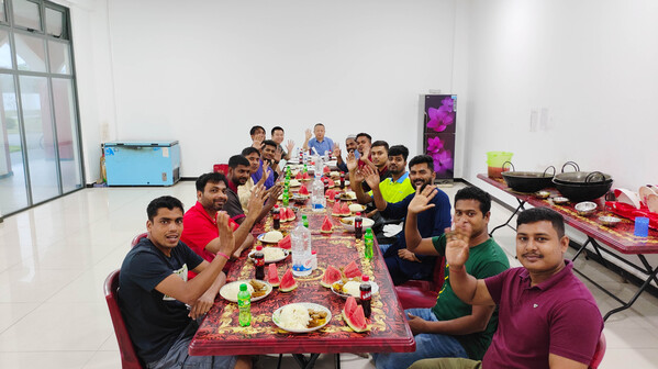 傍晚时分,孟加拉湾的海风渐渐褪去白日的燥热。落日余晖铺洒开来,将中国电建巴瑞萨电站高耸的厂房染成温暖的金色。远处河面波光粼粼,近处机组低沉而有力的轰鸣,与清真寺传来的悠扬宣礼声交织在一起,成为这个斋月里最熟悉的背景。 孟方食堂灯火通明,蒸汽升腾,一场带着烟火气的聚会正在展开。 今晚,是一场特殊的“家宴”。在开斋节即将到来之际,巴瑞萨发电公司为坚守岗位的孟籍员工准备了一场节前聚餐。 这个斋月,对巴瑞萨项目团队来说并不轻松。电站累计发电量刚刚突破50亿千瓦时,外海锚地5.6万吨级煤船完成靠泊,紧接着机组A级检修筹备全面铺开。重要工作一项接着一项,紧张的节奏几乎没有停过。 现场节奏紧,叠加斋月白天禁食禁水,大家的辛苦都能看得见。 “白天不能吃喝,还要盯现场、保运行,确实不容易。”开席前,巴瑞萨发电公司常务副总经理举起水杯,语气真诚,“今晚不谈工作,我们一家人,提前过个节。” 一句“我们一家人”,让现场的氛围一下子松弛下来。 椰枣首先被端上桌。宣礼声落下,人们轻轻入口,甘甜在舌尖弥散,结束了一天的斋戒。随后,辛香馥郁的咖喱羊肉、酥润柔软的孟式油饼等本地菜肴陆续上桌,中方厨师准备的红烧牛腩、清炒时蔬也热气腾腾。中孟风味在一张餐桌上自然融合,就像这支团队的日常。 席间,助理工程师纳西姆笑着说道:“这个月,很多现场的重活,都是中国师傅帮我们分担的。”他的话不多,却引来周围同事的连连点头。 在巴瑞萨电站,“师徒结对”早已形成默契。斋月期间,孟籍员工白天禁食禁水,体力消耗大。中方师傅们主动多承担巡检、设备消缺等工作,将相对轻便的内业整理、资料更新等任务留给他们。没有刻意安排,大家却配合得很自然。 这样的配合,在燃料保供一线也一样。 餐桌另一侧,物流工程师比乔伊正聊起白天的工作。“这船煤整体不错,水尺数据也都没问题。”他说得很认真。对负责煤炭采购和入厂检验的他来说,这段时间同样紧张。 几天前,5.6万吨级煤炭母船顺利靠泊。从外海锚地接卸,到运输进厂,再到取样、化验、数据核对,每一步都不能出差错。斋月里,比乔伊白天照常在码头盯作业,协调节奏、盯紧质量,一忙就是大半天。 “最难的是在码头盯现场,太阳大,又不能喝水。”他笑了笑,“但煤稳了,机组就稳,值。” 一旁的中方同事接过话:“他盯煤,比我们还细。”语气里带着认可。 从燃料保障到机组运行,从现场操作到数据核对,不同岗位的人把各自的事情做好,电站就稳稳转起来。 餐桌上的话题也慢慢铺开。有人聊白天的接卸细节,有人说起即将开始的A修准备,也有人翻出手机,给同事看孩子的照片、家人的视频。远离家乡的日子,在这样的时刻显得柔软了一些。 为了让员工安心过节,巴瑞萨发电公司在节前发放了慰问金,并结合生产实际优化排班,尽量兼顾岗位需要与宗教习俗。这些细致入微的安排,像润物无声的细雨,让中孟团队在潜移默化中更加凝聚。 夜色渐深,聚餐接近尾声。 “Eid Mubarak!”(开斋节吉庆)几位中方员工用刚学会的孟加拉语送上祝福,发音略显生涩,却格外真诚。 “谢谢!谢谢!”孟籍员工用不太流利的中文回应,笑容明亮。 这样的互动,在巴瑞萨早已成为日常。从日常生产配合,到节日里的相互祝福,在一天天的相处里,“你”和“我”逐渐变成了“我们”。这场“家宴”,正是这种情感最自然的流露。 走出食堂,夜风微凉。远处的厂房灯火通明,机组平稳运行,电流沿着线路不断输送,点亮千家万户,也映着每一个还在岗位上的身影。