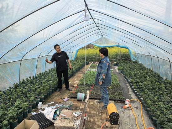 “第一书记”孟宪法(左)调研当地大棚种植产业