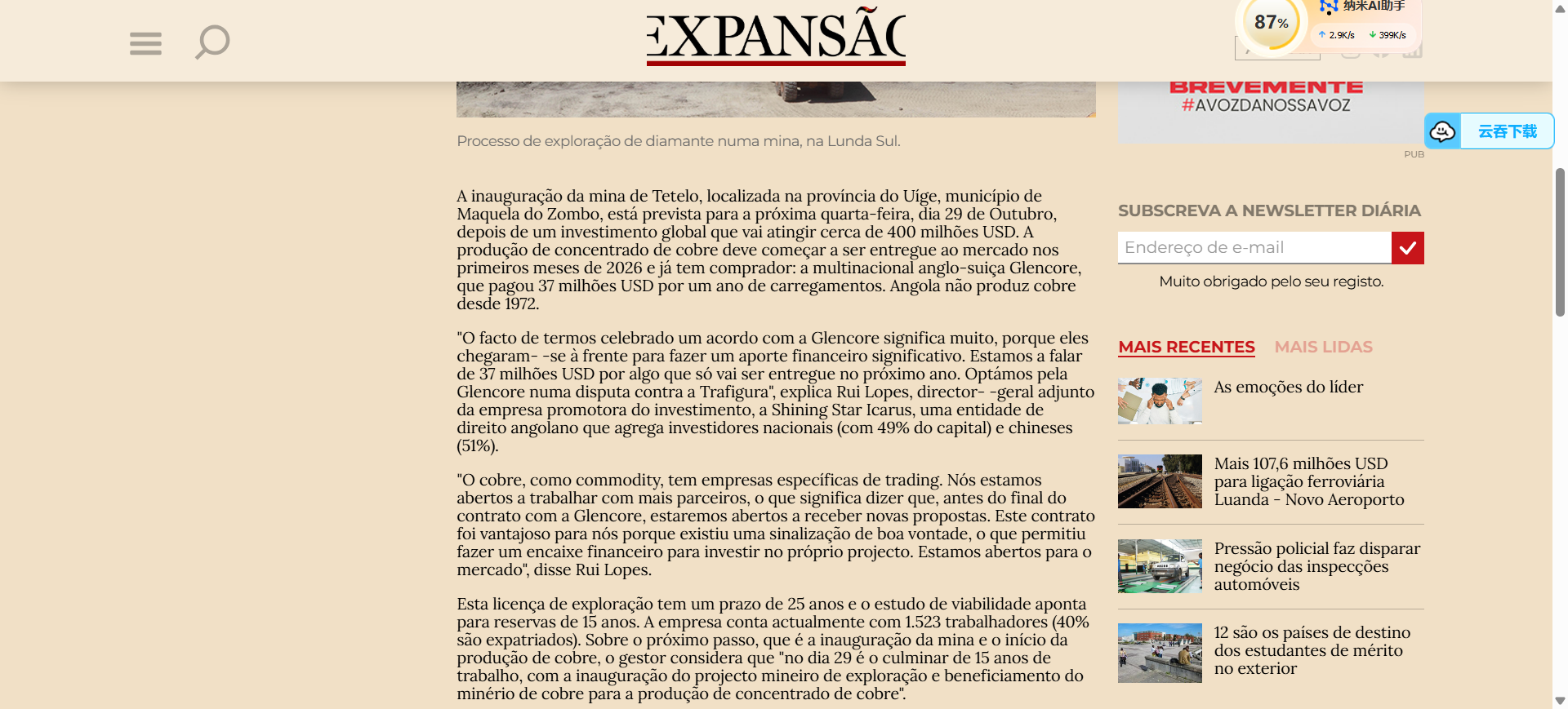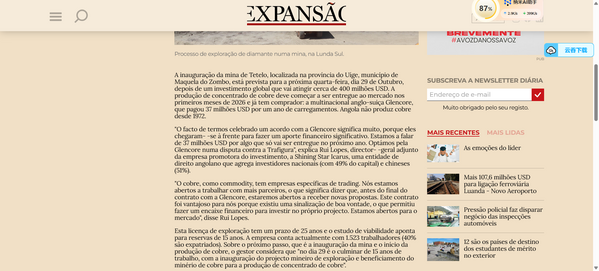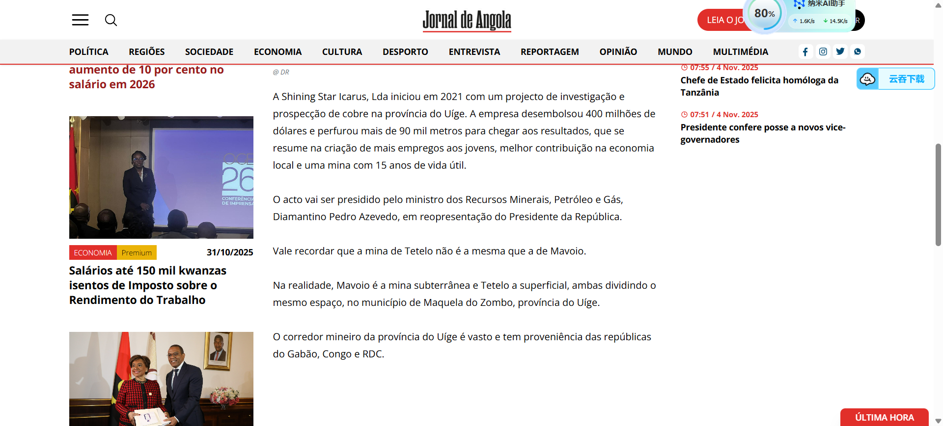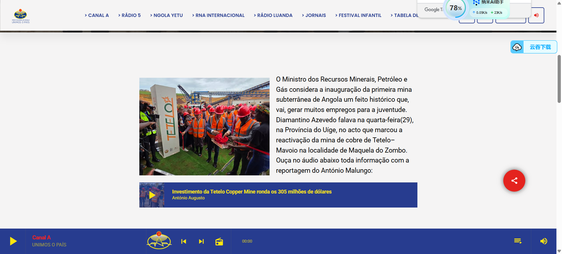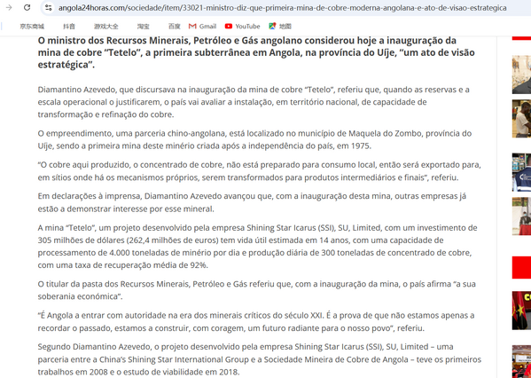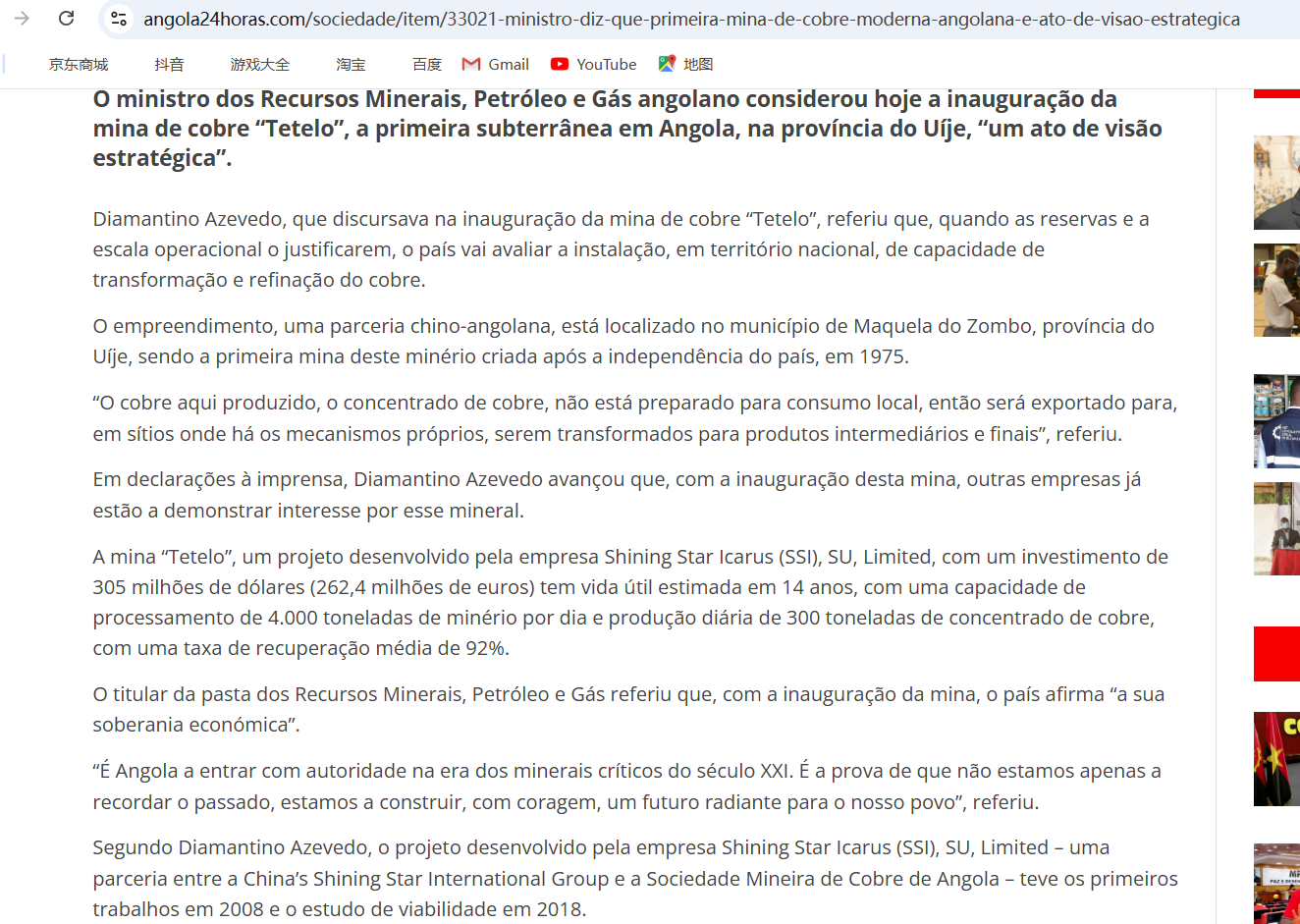 日前,由水电十四局承建的安哥拉Tetelo铜矿投产,铜矿露天开采工作正式启动,安哥拉主流媒体争相进行报道。 《安哥拉国家广播电台》《安哥拉日报》《安哥拉24小时报》等多家当地主流媒体纷纷从经济价值、社会贡献、合作意义等方面,多维度点赞这一里程碑事件。 安哥拉国家广播电台报道:“安哥拉矿业迎来历史性时刻:Tetelo铜矿一期投产,时隔半世纪重启露天铜矿开采。今日对安哥拉矿业而言具有历史性意义。时隔50年后,安哥拉在威热省马克拉杜宗博市马沃约地区正式启动Tetelo铜矿一期项目投产,重新开启露天铜矿开采事业。” 《安哥拉日报》报道:“位于威热省马克拉杜宗博市的Tetelo铜矿今日正式投产,标志着该地区铜矿露天开采工作的启动。项目成果显著,为当地青年创造了更多就业岗位,为地方经济发展作出更大贡献。” 《安哥拉24h报》报道:“安哥拉首座地下铜矿‘Tetelo’投产,中安合作开启新纪元。安哥拉矿产资源、石油与天然气部长今日称,位于威热省的安哥拉首座地下铜矿Tetelo投产,是‘一项具有战略远见的举措’。” 多家主流媒体在报道中强调,中安合作开启新纪元,Tetelo铜矿投产对安哥拉而言具有历史性意义,是巩固国民经济、实现收入来源多元化的重要一步,对安哥拉工业与技术发展具有重要象征意义。同时,Tetelo铜矿为当地创造多个就业岗位、为地方经济发展作出更大贡献。安哥拉政府官员指出“这意味着价值将在本土创造,就业将在本土提供,财富将留存于安哥拉。” Tetelo铜矿的成功投产,是水电十四局践行“一带一路”倡议、深化国际产能合作的又一重要成果。水电十四局将以卓越的工程实力和负责任的企业形象,不断开拓海外市场,在全球市场深化合作,为推动高质量共建“一带一路”行稳致远贡献更多电建力量。 安哥拉广播电台 安哥拉日报 安哥拉24h报 安哥拉财经扩展报 |