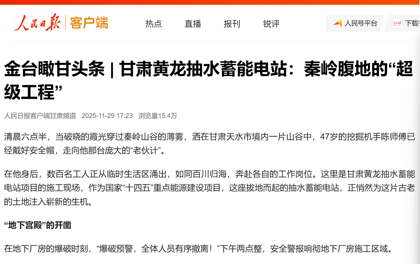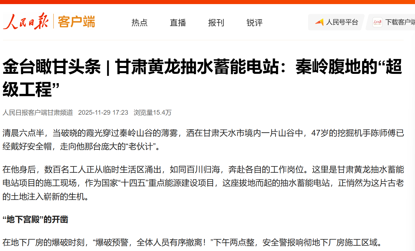 清晨六点半,当破晓的霞光穿过秦岭山谷的薄雾,洒在甘肃天水市境内一片山谷中,47岁的挖掘机手陈师傅已经戴好安全帽,走向他那台庞大的“老伙计”。 在他身后,数百名工人正从临时生活区涌出,如同百川归海,奔赴各自的工作岗位。这里是甘肃黄龙抽水蓄能电站项目的施工现场,作为国家“十四五”重点能源建设项目,这座拔地而起的抽水蓄能电站,正悄然为这片古老的土地注入崭新的生机。 “地下宫殿”的开凿 在地下厂房的爆破时刻,“爆破预警,全体人员有序撤离!”下午两点整,安全警报响彻地下厂房施工区域。 地下730多米,正在开挖的是电站的核心部位——地下厂房,它是整个电站的“心脏”,未来将安装6台350兆瓦立轴单级单转速混流可逆式抽水蓄能机组。声音在巨大的隧洞中产生回响。爆破完成后,通风系统全力运转,工作人员迅速进场检查爆破效果。 项目建设团队严格按照“短进尺、弱爆破、强支护、勤测量”的动态管理机制进行施工,每次爆破只推进3.5米,以极高精度进行。在这个相当于22层楼高的地下空间里,工人们操作着多臂凿岩台车像外科医生般精准地在岩壁上钻孔。尽管作业强度大,但现场井然有序,各类材料堆放整齐,安全标识清晰醒目。 视线转换到下水库大坝的基础开挖工作现场,将来,这座超100m的大坝,将为电站提供近1000万m³的蓄水量,确保项目功能的正常发挥。 混凝土拌和站不停运转,运输车排成长龙。新入职的现场质检员李奇隆呵出一口白气,站在新浇筑的混凝土挡墙前,仔细检查着混凝土的终凝情况与表面质量。不远处,下水库进出水口的开挖与支护作业也正在有序地推进着。 “挡墙浇筑顶面高程正确,养护覆盖完整。”李奇隆在验收单上记录着,笔尖在清冷的空气中略显僵硬。他快步走向进出水口边坡,仔细核对着支护参数:“锚杆间距、坡度符合设计要求,喷锚面完整。每一批混凝土都必须符合严格标准,这关系到未来大坝百年大计。” 进场交通洞是项目施工期的“运输大动脉”、运营期的“检修维护通道”,全生命周期的“安全生命线”。为应对进场交通洞F13断层复杂地质条件、高难度施工挑战,项目建设单位坚持技术先行、安全为本的原则,采取了一系列措施。在方案论证阶段,即组织专家开展现场踏勘与技术论证,为施工提供科学依据;施工过程中,严格执行“管棚超前支护+无盖重固结灌浆”组合工艺,并依托信息化监测系统,实时采集断层区域围岩收敛、位移等关键数据,实现施工参数的动态优化与风险可控,有力保障了工程安全与质量。 惠及地方的动力源 甘肃黄龙抽水蓄能电站项目总投资达159.41亿元,总装机容量210万千瓦,预计2031年6月全部投产发电。电站主要由上水库、下水库、输水发电系统和地下厂房等组成,建成后年设计发电量达23.5亿千瓦时。项目的顺利建设,已经为当地带来了实实在在的变化。 就业机会涌入山村。 “项目开工前,我一直在外地打工,每年只能回家一两次。现在在家门口就能找到工作,收入也不比外面差。”来自附近黄龙村的村民张录录告诉记者,张录录经过培训成为一名挖机司机,他的儿子在项目中从事出渣车班班组长工作。 据统计,项目建设高峰期将创造3000多个直接就业岗位,其中约30%招聘当地居民;产业链带动地方经济,有力巩固拓展脱贫攻坚成果,助力乡村振兴,项目建设还拉动了当地建材、运输、服务等相关行业的发展,同时推动美丽乡村建设,改善人居环境,提升乡村整体风貌。 初步估算,项目建成后每年可为地方增加税收2亿元以上。这些资金将有力支持当地教育、医疗等公共服务建设,基础设施全面提升。为满足大件设备运输需求,甘肃黄龙抽水蓄能电站项目配套改建了约11公里进山道路,使周边4个村庄的交通条件得到根本改善。项目建设还带动了当地电网升级改造,提高了供电可靠性。 服务国家战略的未来蓝图 甘肃黄龙抽水蓄能电站项目建设的意义,远不止于当下的经济效益,而是能源转型的关键支撑。随着我国“双碳”目标的推进,风电、光伏等新能源快速发展,但这些能源具有间歇性、波动性的特点,需要可靠的调节电源。抽水蓄能电站就像电网的“稳定器”和“充电宝”,在用电低谷时抽水蓄能,用电高峰时放水发电。项目建成后主要服务陇东能源基地电力系统,可有效平抑新能源波动,提高电网运行效率,每年可节约标准煤129万吨,减少二氧化碳排放约386.4万吨,对促进实现我国“碳达峰、碳中和”目标意义重大。 甘肃黄龙抽水蓄能电站项目位于西北电网中心位置,建成后将显著提高电网调峰能力,促进新能源消纳,为甘肃乃至整个西北地区的能源安全提供坚实保障。乡村振兴的新引擎电站建成后,上、下水库将形成新的景观,未来还可开发生态旅游,助力乡村振兴。 甘肃黄龙抽水蓄能电站项目积极引入数智化管控平台,全面强化质量全流程管控,着力攻关核心技术,以数智化手段赋能抽水蓄能建设实现提质增效,为我国抽水蓄能行业的高质量发展积累了重要经验。面对项目“三高两大一新两复杂”的工程特点,项目团队深入开展《高地震区高沥青混凝土心墙堆石坝结构设计及筑坝材料关键技术研究》等科研课题,取得显著成果:已成功申报专利6项,投稿高质量论文2篇,为高地震区高沥青混凝土心墙堆石坝类大型工程的建设提供了有益参考与技术支撑。 黄昏时分,施工