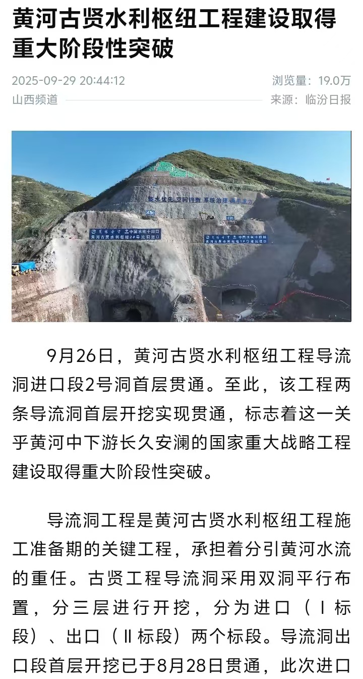 9月29日,新华社客户端以《黄河古贤水利枢纽工程建设取得重大阶段性突破》为题,对水电十四局参建的黄河古贤水利枢纽工程进行了相关报道。 报道指出:9月26日,黄河古贤水利枢纽工程导流洞进口段2号洞首层贯通。至此,该工程两条导流洞首层开挖实现贯通,标志着这一关乎黄河中下游长久安澜的国家重大战略工程建设取得重大阶段性突破。 导流洞工程是黄河古贤水利枢纽工程施工准备期的关键工程,承担着分引黄河水流的重任。古贤工程导流洞采用双洞平行布置,分三层进行开挖,分为进口(Ⅰ标段)、出口(Ⅱ标段)两个标段。导流洞出口段首层开挖已于8月28日贯通,此次进口段首层开挖贯通,为后续导流洞二、三层的开挖支护和二次衬砌等工序全面铺开创造了先决条件。 黄河古贤水利枢纽工程是黄河水沙调控体系的重要组成部分和国家水网的重要节点工程,建成后将充分发挥防洪减淤、供水灌溉、发电降碳、生态保护等综合效益。(梁新红 霍壮 贺建飞) 报道链接:https://h.xinhuaxmt.com/vh512/share/12758654?docid=12758654&newstype=1001&d=1350131&channel=weixin&time=1759153764994 |