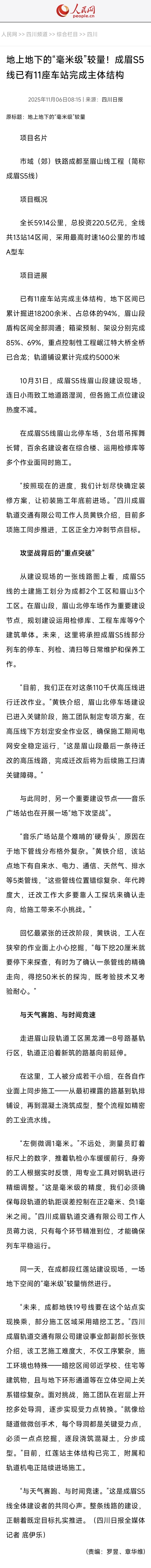 项目名片 市域(郊)铁路成都至眉山线工程(简称成眉S5线) 项目概况 全长59.14公里,总投资220.5亿元,全线共13站14区间,采用最高时速160公里的市域A型车 项目进展 已有11座车站完成主体结构,地下区间已累计掘进18200余米、占总体的94%,眉山段盾构区间全部洞通;箱梁预制、架设分别完成85%、69%,重点控制性工程岷江特大桥全桥已合龙;轨道铺设累计完成约5000米 10月31日,成眉S5线眉山段建设现场,连日小雨致工地道路湿润,但各施工点位建设热度不减。 在成眉S5线眉山北停车场,3台塔吊挥舞长臂,百余名建设者在综合楼、运用检修库等多个作业面同时施工。 “按照现在的进度,我们计划尽快确定装修方案,让初装施工年底前进场。”四川成眉轨道交通有限公司工作人员黄铁介绍,目前多项施工同步推进,工区正全力冲刺节点目标。 攻坚战背后的“重点突破” 从建设现场的一张线路图上看,成眉S5线的土建施工划分为成都2个工区和眉山3个工区。在眉山段,眉山北停车场作为重要建设节点,规划建设运用检修库、工程车库等9个建筑单体。未来,这里将承担成眉S5线部分列车的停车、列检、清扫等日常维护和保养工作。 “目前,我们正在对这条110千伏高压线进行迁改作业。”黄铁介绍,眉山北停车场建设已进入关键阶段,施工团队制定专项方案,在高压线下方划定安全作业区,确保施工期间电网安全稳定运行,“这是眉山段最后一条待迁改的高压线路,完成迁改后将为后续施工扫清关键障碍。” 与此同时,另一个重要建设节点——音乐广场站也在开展一场“地下攻坚战”。 “音乐广场站是个难啃的‘硬骨头’,原因在于地下管线分布格外复杂。”黄铁介绍,该站点地下有自来水、电力、通信、天然气、排水等5类管线,“这些管线位置错综复杂、年代跨度大,迁改工作大多要靠人工探坑来确认走向,给施工带来不小挑战。” 回忆最紧张的迁改阶段,黄铁说,工人在狭窄的作业面上小心挖掘,“每下挖20厘米就要停下来探查,有时为了确认一条管线的精确走向,得挖50米长的探沟,既考验技术又考验耐心。” 与天气赛跑、与时间竞速 走进眉山段轨道工区黑龙滩—8号路基轨行区,轨道正沿着新筑的路基向前延伸。 在这里,工人被分成若干小组,在各自作业面上同步施工——从最初裸露的路基到轨排铺设,再到混凝土浇筑成型,整个流程如精密的工业流水线。 “左侧微调1毫米。”不远处,测量员盯着标尺上的数字,推着轨检小车缓缓前行,身旁的工人根据实时反馈,用专业工具对钢轨进行精细调整。“这是毫米级的精度,我们必须确保每段轨道的轨距误差控制在正2毫米、负1毫米之间。”四川成眉轨道交通有限公司工作人员蒋力说,只有每个环节精准到位,才能确保列车平稳运行。 同一天,在成都段红莲站建设现场,一场地下空间的“毫米级”较量悄然进行。 “未来,成都地铁19号线要在这个站点实现换乘,部分施工区域采用暗挖工艺。”四川成眉轨道交通有限公司建设事业部副部长张铁介绍,该工艺施工难度大,不仅工序繁杂,施工环境也特殊——暗挖区间邻近学校、住宅等建筑物,且与地下环形通道等在立体空间上关系错综复杂。面对挑战,施工团队在岩层上开挖多处导洞,逐步实现受力点转换。“就像给隧道做微创手术,每个导洞都是关键受力点,必须一点点挖掘,逐段浇筑混凝土,分步成型。”目前,红莲站主体结构已完工,附属和轨道机电正陆续进场施工。 “与天气赛跑、与时间竞速。”这是成眉S5线全体建设者的共同心声。整条线路的建设,正朝着既定目标扎实推进。 链接:http://sc.people.com.cn/n2/2025/1106/c379470-41402734.html |