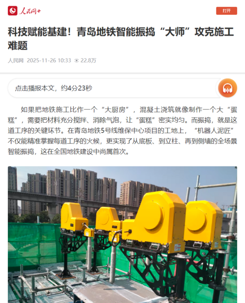 11月26日,人民网发布文章《科技赋能基建!青岛地铁智能振捣“大师”攻克施工难题》,关注报道了由中国电建所属水电三局承建的青岛地铁5号线维保中心项目通过创新应用智能振捣设备,助力项目建设提质增效。 文章指出,如果把地铁施工比作一个“大厨房”,混凝土浇筑就像制作一个大“蛋糕”,需要把材料充分搅拌、消除气泡,让“蛋糕”密实均匀。而振捣,就是这道工序的关键环节。在青岛地铁5号线维保中心项目的工地上,“机器人泥匠”不仅能精准掌握每道工序的火候,更实现了从底板、到立柱、再到侧墙的全场景智能振捣,这在全国地铁建设中尚属首次。文章强调,从今年9月立柱自动化振捣首次应用,到11月一举攻下难度最高的侧墙施工,智能振捣设备持续推动项目从“人力密集型”向“技术密集型”转型,以其精准、高效、安全的作业优势,持续刷新着混凝土施工的质量与效率纪录,有效降低了施工成本、作业强度与安全风险,为项目高质量推进注入了强劲动力。 水电三局青岛地铁5号线维保中心项目勇于创新,持续攻坚,结合项目实际情况自主研发出智能振捣设备。该设备集全自动操作、高精度振捣、数据化追溯于一体,可实时优化振捣方案,保障施工质量,在复杂结构施工中高效完成振捣作业。项目团队结合现场施工经验,对智能振捣设备的行走路径、振捣点位布置等关键参数进行多轮优化调整,通过“实践积累—总结复盘—迭代优化”的闭环工作模式,让智能化设备充分适配现场复杂施工条件,确保了智能化设备与现场施工条件的契合。 |