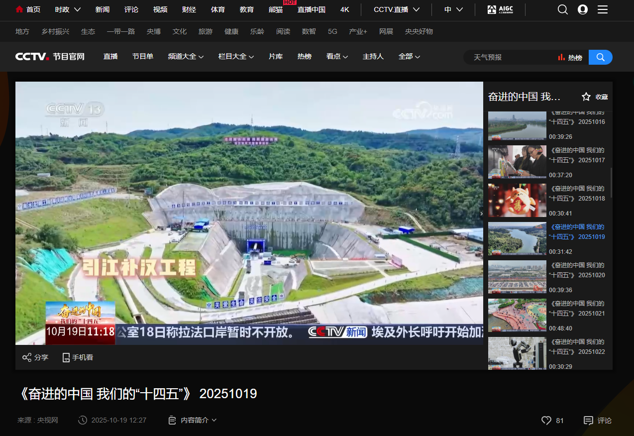 2025年是“十四五”收官之年,10月19日,央视新闻专题栏目《水润华夏 治水兴邦》,对五局参建的引江补汉工程、引江济淮二期工程等多个项目的建设历程与综合效益进行了详细报道。 引江补汉工程输水总干线出口段工程作为首个开工的南水北调后续工程重大项目,该工程实施后将把南水北调工程和三峡工程连接起来,进一步打通长江向北方输水通道,增加中线一期工程北调水量,提高中线工程供水保证率,加快构建国家水网主骨架和大动脉。同时,还将向汉江中下游补水,对提高汉江流域水资源调配能力,改善汉江中下游水生态环境具有重要作用,建成后将有力支撑湖北区域经济高质量发展,长久造福湖北人民。 合肥水源工程为安徽省引江济淮二期工程(水利部分)骨干供水板块中一个子项,为引江济淮向合肥市城市供水的重要输水工程。合肥水源工程规划设计输水流量40.0立方米每秒。从江淮沟通段与淠河总干渠渡槽交口的东北角采用箱涵取水,经泵站提水,采用箱涵输水至淠河总干渠,继而向滁河干渠(合肥供水)和潜南干渠进行补水,其建设内容为新建小庙提水站(含取水、输水箱涵)。小庙提水站上游距离蜀山枢纽约16.1千米,下游距离瓦埠湖约40.3千米,输水线路全长约810米。 链接:https://tv.cctv.com/2025/10/19/VIDEbly1n5aDVMO3wexp0lT0251019.shtml |