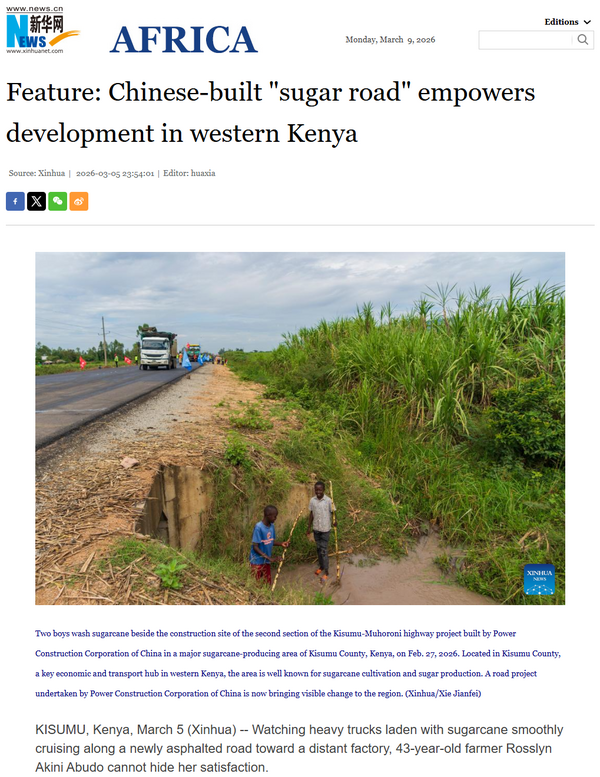 2月27日,新华社记者访问由肯尼亚基苏木-穆霍罗尼道路建设第二标段项目,因其对当地经济社会发展的突出贡献,获得《新华网》的密集报道和高度评价,《人民日报》《国务院新闻办公室》《World News》等主流新闻门户网站跟进转发,获得社会广泛关注和赞赏。这条被当地民众亲切唤作“糖路”的公路,正作为中肯务实合作的标杆项目,赢得社会各界的广泛赞誉。 此次备受关注的基苏木第二标段项目,是肯尼亚政府重点推动的基础设施工程,业主为肯尼亚高速公路局,这条路贯穿基苏木郡的主要甘蔗种植带,连接起种植园与糖厂,是当地名副其实的“糖路”,未来更将连接通往乌干达边境的公路,成为肯尼亚西部的重要运输走廊。报道中高度评价了这一项目在促进农业发展、提升区域联通方面的显著效益。项目建成后,将极大改善沿线农产品运输条件,降低物流成本,为肯尼亚的“糖带”注入新的经济活力。 在履约过程中,项目团队始终将社会责任放在重要位置并进行团队深入探索“属地化”建设,大量聘用并系统培训当地员工,直接创造就业岗位超过200个,涵盖测量、设计、设备操作等多个领域,真正做到了“授人以渔”,为当地留下了一支带不走的工程建设队伍,这种深度融入当地、服务民生的做法,赢得了当地政府、社区和民众的广泛赞誉。 基苏木第二标段项目所获的关注,不仅是国际社会对中国工程品质的认可,更是对中肯携手同行、共谋发展生动实践的肯定。它为共建“一带一路”倡议在肯尼亚的深入实施贡献了坚实力量,谱写了新时代中非合作共赢、共同发展的崭新篇章。 |
