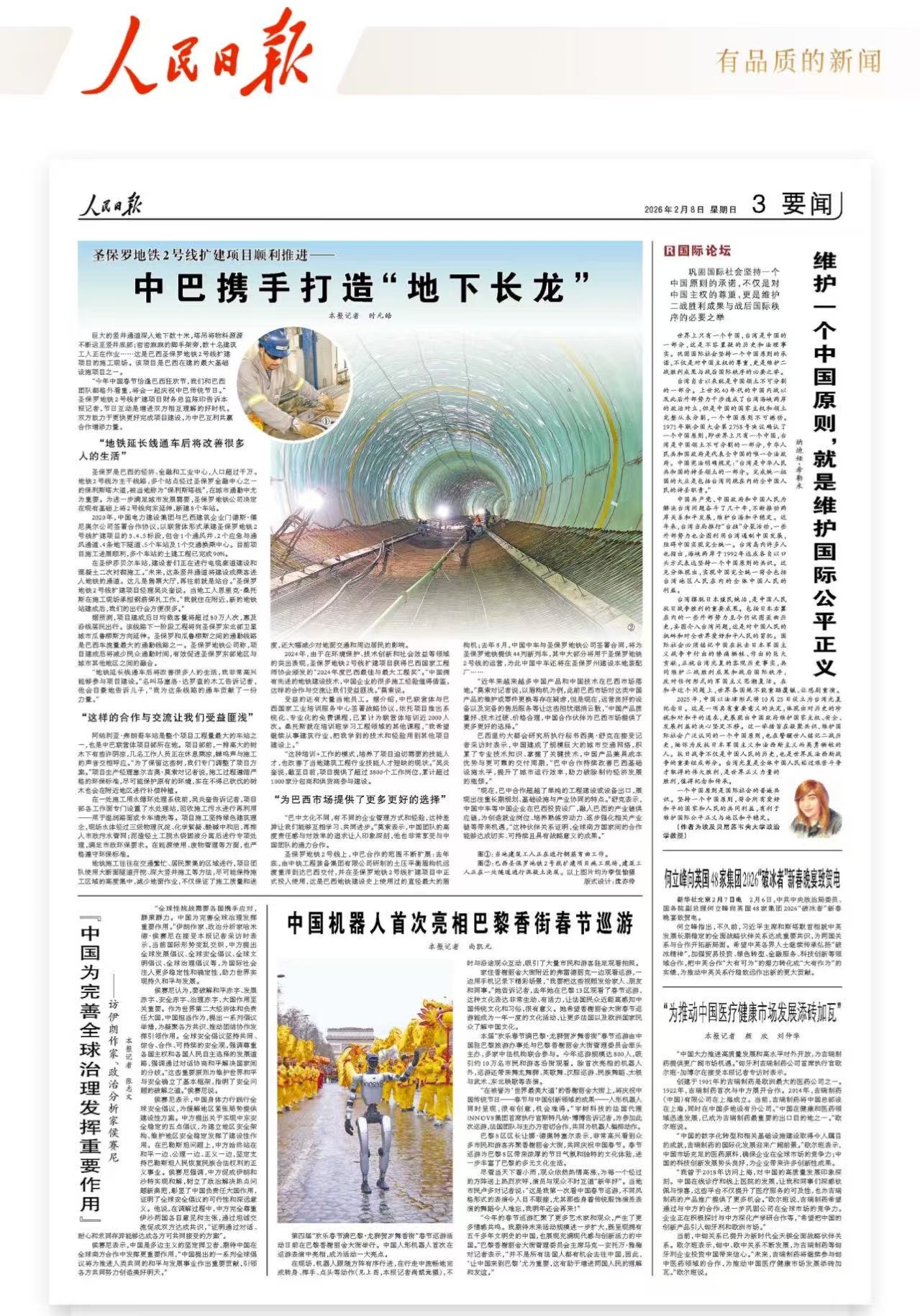 巨大的竖井通道深入地下数十米,塔吊将物料源源不断运至竖井底部;密密麻麻的脚手架旁,数十名建筑工人正在作业……这是巴西圣保罗地铁2号线扩建项目的施工现场。该项目是巴西在建的最大基础设施项目之一。 “今年中国春节恰逢巴西狂欢节,我们和巴西团队都格外看重,将会一起庆祝中巴传统节日。”圣保罗地铁2号线扩建项目财务总监陈印告诉本报记者,节日互动是增进双方相互理解的好时机。双方致力于更快更好完成项目建设,为中巴互利共赢合作增添力量。 “地铁延长线通车后将改善很多人的生活” 圣保罗是巴西的经济、金融和工业中心,人口超过千万。地铁2号线为主干线路,多个站点经过圣保罗金融中心之一的保利斯塔大道,被当地称为“保利斯塔线”,在城市通勤中尤为重要。为进一步满足城市发展需要,圣保罗地铁公司决定在现有基础上将2号线向东延伸,新建8个车站。 2020年,中国电力建设集团与巴西建筑企业门德斯·儒尼奥尔公司签署合作协议,以联营体形式承建圣保罗地铁2号线扩建项目的3、4、5标段,包含1个通风井、2个应急与通风通道、4条地下隧道、5个车站及1个交通换乘中心。目前项目施工进展顺利,多个车站的土建工程已完成90%。 在圣伊莎贝尔车站,建设者们正在进行电缆廊道建设和混凝土二次衬砌施工。“未来,这条竖井通道将建设成乘客进入地铁的通道。这儿是售票大厅,再往前就是站台。”圣保罗地铁2号线扩建项目经理吴炎奎说。当地工人恩里克·桑托斯在施工现场承担钢筋绑扎工作,“我就住在附近,新的地铁站建成后,我们的出行会方便很多。” 据预测,项目建成后日均载客量将超过80万人次,惠及沿线居民出行。该线路下一阶段工程将向圣保罗东北部卫星城市瓜鲁柳斯方向延伸。圣保罗和瓜鲁柳斯之间的通勤线路是巴西车流量最大的通勤线路之一。圣保罗地铁公司称,项目建成后将减少民众通勤时间,有效促进圣保罗东部地区与城市其他地区之间的融合。 “地铁延长线通车后将改善很多人的生活,我非常高兴能够参与项目建设。”名叫马塞洛·达罗查的木工告诉记者,他会自豪地告诉儿子,“我为这条线路的通车贡献了一份力量。” “这样的合作与交流让我们受益匪浅” 阿纳利亚·弗朗哥车站是整个项目工程量最大的车站之一,也是中巴联营体项目部所在地。项目部前,一排高大的树木下有些许阴凉,几名工作人员正在休息乘凉,蝉鸣声与施工的声音交相呼应。“为了保留这些树,我们专门调整了项目方案。”项目生产经理塞尔吉奥·莫索对记者说,施工过程遵循严格的环保标准,尽可能保护原有的环境,实在不得已砍伐的树木也会在附近地区进行补偿种植。 在一处施工用水循环处理系统前,吴炎奎告诉记者,项目部各工作面专门设置了水处理站,回收施工污水进行再利用——用于湿润路面或卡车清洗等。项目施工坚持绿色建筑理念,现场水体经过三级物理沉淀、化学絮凝、酸碱中和后,再排入市政污水管网;泥渣经土工脱水袋固液分离后进行专项处理,满足市政环保要求。在能源使用、废物管理等方面,也严格遵守环保标准。 地铁施工往往在交通繁忙、居民聚集的区域进行,项目团队使用大断面隧道开挖、深大竖井施工等方法,尽可能保持施工区域的高度集中,减少地面作业,不仅保证了施工质量和进度,还大幅减少对地面交通和周边居民的影响。 2024年,由于在环境保护、技术创新和社会效益等领域的突出表现,圣保罗地铁2号线扩建项目获得巴西国家工程师协会颁发的“2024年度巴西最佳与最大工程奖”。“中国拥有先进的地铁建设技术,中国企业的很多施工经验值得借鉴,这样的合作与交流让我们受益匪浅。”莫索说。 受益的还有大量当地员工。据介绍,中巴联营体与巴西国家工业培训服务中心签署战略协议,依托项目推出系统化、专业化的免费课程,已累计为联营体培训近2000人次。桑托斯就在培训班学习工程领域的其他课程,“我希望继续从事建筑行业,把我学到的技术和经验用到其他项目建设上。” “这种培训+工作的模式,培养了项目迫切需要的技能人才,也改善了当地建筑工程行业技能人才短缺的现状。”吴炎奎说,截至目前,项目提供了超过3800个工作岗位,累计超过1000家分包商和供货商参与建设。 “为巴西市场提供了更多更好的选择” “巴中文化不同,有不同的企业管理方式和经验,这种差异让我们能够互相学习、共同进步。”莫索表示,中国团队的高度责任感与对效率的追求让人印象深刻,他也非常享受与中国团队的通力合作。 圣保罗地铁2号线上,中巴合作的范围不断扩展:去年底,由中铁工程装备集团有限公司研制的土压平衡盾构机远渡重洋到达巴西交付,并在圣保罗地铁2号线扩建项目中正式投入使用,这是巴西地铁建设史上使用过的直径最大的盾构机;去年8月,中国中车与圣保罗地铁公司签署合同,将为圣保罗地铁提供44列新列车,其中大部分将用于圣保罗地铁2号线的运营,为此中国中车还将在圣保罗州建设本地装配厂…… “近年来越来越多中国产品和中国技术在巴西市场落地。”莫索对记者说,以盾构机为例,此前巴西市场对这类中国产品的维护或零件更换等存在疑虑,但是现在,运营良好的设备以及完备的售后服务等让这些担忧烟消云散,“中国产品质量好、技术过硬、价格合理,中国合作