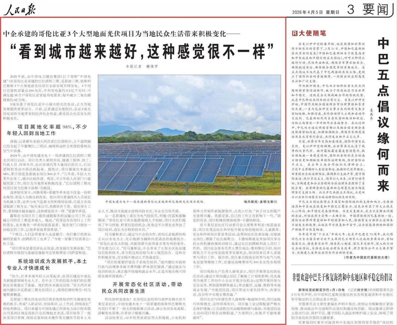 2025年底,由中国电力建设集团(以下简称“中国电建”)在哥伦比亚承建的巴拉诺阿三期、瓜耶波三期、埃斯科巴勒斯3个大型地面光伏项目全部实现并网发电。3个项目总装机容量达260兆瓦,年均发电量约5.2亿千瓦时,可满足超35万户哥伦比亚家庭用电需求,每年减少二氧化碳排放约42万吨。 3座坐落于哥伦比亚中小城市的光伏电站,正为当地发展提供更多动力。日前,记者通过实地探访,见证3座光伏电站给当地带来的经济社会效益,感受民众生活发生的积极变化。 项目属地化率超98%,不少年轻人回到当地工作 清晨,记者乘车来到大西洋省巴拉诺阿市,主干道两侧已经支起了早餐摊位,三明治、咖啡和油炸玉米饼的香味在空气中弥漫。 2024年,由中国电建水电十一局承建的巴拉诺阿三期光伏项目启动。项目负责人梁明华说,随着工程师、技工、行政人员、环保专员、社区协调员等大量岗位的引入,巴拉诺阿的劳动市场活跃起来。据统计,项目属地化率超过98%,累计创造直接就业岗位500余个。“几年前,年轻人大多外出务工,城市比较冷清。现在,不少年轻人在家门口就能找到工作,项目为当地带来积极改变。”巴拉诺阿三期光伏项目哥方经理卡洛斯·贝略说。 选择留在家乡,对路易斯·爱德华多来说不仅是一份职业规划,更是人生路径的改变。他从项目普通技术人员成长为机械主管,还参与电气监督支持和现场协调,目前正在攻读能源工程专业。“每天来公司,我都很有干劲。留在家乡工作,看到城市越来越好,这种感觉很不一样。”爱德华多说。 露斯在为项目员工提供通勤服务的运输公司工作,运输公司的员工都是本地人。她说,“我身边有在项目上工作的朋友,也有像我一样的间接获益者。能在家门口拥有一份稳定的工作,让很多家庭看到希望。” “下班后,人们会带着家人走进餐厅。我们餐厅的营业额明显提升,招聘的员工也多了。”当地一家餐厅经营者让·杜兰说。 “项目带来显著经济社会效益,改变城市发展面貌。”巴拉诺阿市规划与基础设施秘书克里斯蒂安·冈萨雷斯说。 系统培训成为发展抓手,本土专业人才快速成长 “如今,许多本地年轻人从零起步,在项目建设中成长为新能源领域专业人才。在中企工作的经验为他们的长期职业发展奠定了基础。他们的未来就在这里。”在大西洋省波内德拉市瓜耶波三期光伏项目上,现场经理哈维尔·托马塞斯感慨道。 瓜耶波三期光伏电站项目将系统性培训作为属地化发展的抓手,形成“入职必训、分岗再训、以工代训、持续成长”的培养路径。项目承建方中国电建江西省电力设计院有限公司美洲区域总部执行总经理赵忠杰说,项目培养了一批涉及项目管理、现场安装和技术操作等关键环节的本土专业人才,推动当地就业结构向技术化、专业化方向升级。 从一名普通电工成长为电气检验员,何塞·托雷斯感触颇深。“哥伦比亚可再生能源领域人才短缺,项目为我们提供了学习技能、积累经验的机会,我身边不少朋友也参加了项目培训,成长为合格的技术员。” 托马塞斯表示,通过与中企的合作,哥伦比亚能源结构正从以水电为主、化石能源为辅转向更清洁的能源组合。“哥伦比亚在太阳能、风能资源方面具备非常有利的条件,开发潜力巨大。”托马塞斯说,中企带来了大型光伏电站建设经验和技术,哥方把这些经验与本土规范结合。这种合作积极有效,在实践中推动人才快速成长。 “项目的重要价值在于系统化培训。”波内德拉市政府行政与治理事务秘书费利佩·萨米恩托强调,“通过就业与培训的结合,真正提升技能和就业水平,正是当地实现可持续发展所需要的。” 开展常态化社区活动,带动民众共同改善生活 阳光如何变成电?在哥伦比亚托利马省伊瓦格市皮卡莱尼亚社区,中国电建水电十一局承建的埃斯科巴勒斯光伏项目开展了一场太阳能板展示活动,演示光伏发电流程、讲解发电原理,许多孩子颇感兴趣。 活动结束后,12岁的男孩胡安用太阳能板、小电机和简单元件制作新能源组件,点亮小灯泡。“孩子对太阳能产生浓厚兴趣。我感受到,自己的工作正在影响下一代。”胡安的母亲、项目机械助理詹妮弗·卡德纳斯说。 皮卡莱尼亚社区行动委员会主席维多利亚·埃雷迪亚说,项目在周边社区和学校开展女性技能培训、儿童教育、安全和环保知识普及等活动,还帮助社区改善设施、对接就业岗位,增强了社区凝聚力。卡德纳斯就是参加项目举办的女性机械助理培训班后,通过社区招聘顺利进入项目工作的。项目社会事务负责人费尔南达·奥利维拉介绍,培训班致力于为女性创造更多发展机会,培训结束后多人直接参与项目工作。据介绍,项目重点吸纳女性参与电气与机电安装等精细工作,在建设高峰期有约300名女性在现场工作。 项目现场生产负责人唐亮表示,项目开展常态化的社区活动:通过日常沟通让居民了解施工计划和影响,优先雇用当地劳工并向中小企业开放分包机会;定期开展环保与安全宣传,帮助弱势群体就业;带动餐饮、运输、维修等本地商业发展。“当地居民说,项目带动大家共同参与、改善生活,在合作中实现长期共赢。” 项目生态与环境负责人詹姆斯·梅迪纳介绍,项目还践行环保理念、宣传环保知识。项目施工全过程配套严格生态保护措施,已完成数百次动植物转移与救助,当地居民还主动向