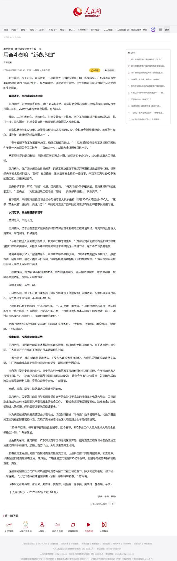 近日,人民网对水电五局参建项目进行了关注并报道。原文如下: 新元肇启,实干开年。春节假期,一项项重大工程建设抢抓工期、连续攻坚,在机械轰鸣声中奏响激昂奋进的“新春序曲”。东西南北中,建设者坚守岗位,用火热的奋斗足迹勾勒出奋进中国的生动图景。 绿电奔涌,发展动能积聚成势 正月初六,江西赣州赣县抽水蓄能电站建设现场,悬挂的灯笼洋溢着喜气。在下水库泄洪放空洞,工人正对开挖完成的工作面进行基础清理和衬砌。 “春节假期,我们组建党员攻坚队,170多名建设者坚守岗位,为项目后续建设奠定坚实基础。”江西峰山抽水蓄能有限公司党总支委员、副总经理华国介绍。 来自四川资阳安岳县的彭伟,是中国水利水电第五工程局有限公司项目经理,今年特地把家人接到项目过年。“这条下水库泄洪放空洞目前已完成90%,计划今年3月上旬贯通,为保障年后截流及大坝填筑顺利实施,春节必须坚守岗位。”彭伟说。 奉献、担当、坚守,绘就重大工程建设的底色。 (本报记者叶传增、张云河、郑洋洋、窦瀚洋、杨颜菲、徐驭尧、姜晓丹、韩春瑶、余璇) 《 人民日报 》( 2026年02月23日 01 版) (责编:牛镛、曹昆) 链接:http://society.people.com.cn/n1/2026/0223/c1008-40668442.html |