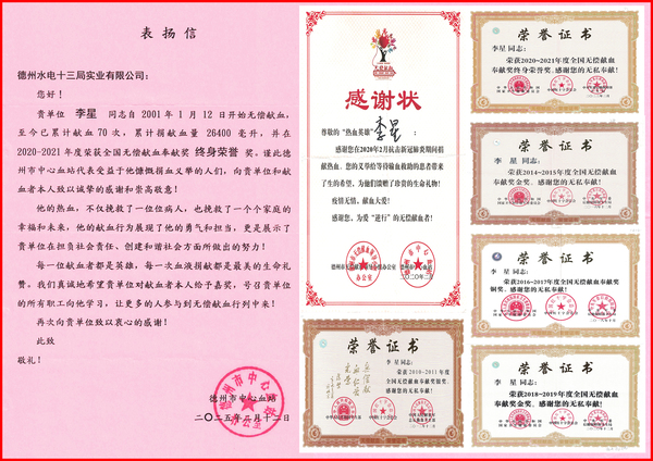 日前,电建市政公司收到一封德州市中心血站特别发来的表扬信,市政公司员工李星长期坚持无偿献血,荣获全国无偿献血最高奖——2020-2021年度全国无偿献血奉献奖终身荣誉奖,信中对李星及公司致以诚挚的感谢和崇高的敬意。 自2001年1月12日首次献血,李星至今已经坚持了25年,累计献血70次,捐献血量和成分血共计26400毫升,相当于5名成年人的血液量总和。 李星憨笑着回忆起第一次献血,当时29岁的他第一次注意到献血车,看到了“光荣献血 让爱传递”的宣传海报,后来发现献血车上挂着O型血的告急牌,想到自己是O型血,就登上了献血车,开始了人生中的第一次献血。“我也没想到能坚持到现在,一年只能献两次血,算上捐献血小板的次数,2024年5月我完成了人生中第70次献血。”他用朴实的话语,简短介绍了自己以热血传递爱心、为公益事业贡献力量的初衷和经历,令人十分触动。 李星的热血不仅挽救了无数病患的生命,也为许多家庭带来了希望与幸福。2014年9月,他开始献成分血,只要接到德州市中心血站急需成分血的来电,他便毫不犹豫地赶去血站捐献。从2014年至2019年,李星总计献了68个治疗量。在2021年抗击新冠肺炎疫情期间,无偿献血人数骤减,而血站用血量却在不断增加,李星冒着被感染的风险依然坚持为爱献血,被德州市中心血站授予2021年度“热血英雄”的荣誉称号。 这些年来,李星先后多次获得“全国无偿献血奉献奖金奖”“全国无偿献血奉献奖银奖”“全国无偿献血奉献奖铜奖”等奖项,国家卫生健康委、中国红十字会总会、中央军委后勤保障部联合授予的“2020—2021年度全国无偿献血奉献奖终身荣誉奖”,那一本本鲜红的《无偿献血证》与荣誉证书见证了他的无私奉献精神。他用实际行动诠释了“大爱无疆”,展现了市政公司员工的社会责任感和高尚品德。 李星获得的部分荣誉 |