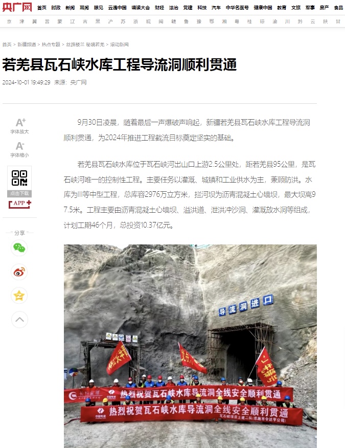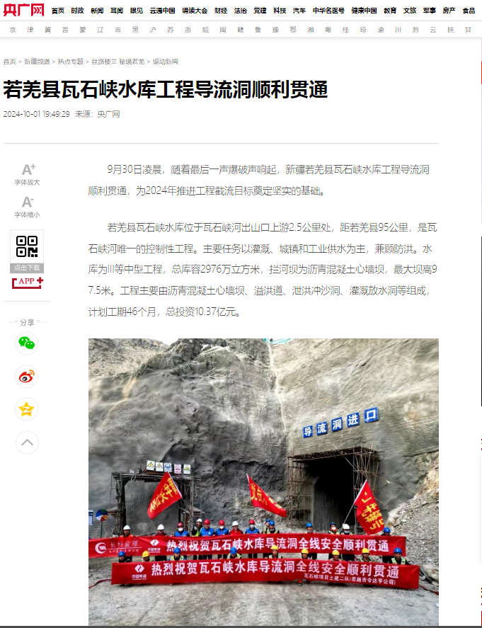 10月1日,央广网对由中国水电十五局承建的瓦石峡水库导流洞全线顺利贯通进行了报道。 报道中指出,瓦石峡水库工程作为新疆维吾尔自治区重点项目,自3月开工以来,一直备受各方关注。其中特别指出,工程建设中,采用短进尺、强支护及洞内智能沉降监测等强有力措施,大大提高了安全性。加强现场施工组织管理和质量控制,严格落实‘三检制’,通过控制测量及爆破孔等各工序质量控制,确保每个施工环节都符合设计及规范要求。 随着导流洞的顺利贯通,若羌县瓦石峡水库工程项目的整体建设进度将进一步加快。项目团队将继续紧盯工程实体质量提升、绿色文明施工等目标,不断提升项目精细化管理水平,为新疆建设贡献一份力量。 瓦石峡水库工程是纳入《新疆“十四五”水安全保障规划》和《黄河流域(片)“十四五”水安全保障规划》的自治区2022年重点水利项目。工程位于新疆巴音郭楞蒙古自治州若羌县境内的瓦石峡河出山口上游2.5千米处,是瓦石峡河唯一的控制性工程,主要任务以灌溉、城镇和工业供水为主,兼顾防洪。工程建成后,可有效控制瓦石峡河的行洪能力,大大减少下游洪水水患,解决流域防洪问题,并且从根本上解决本流域工业发展的用水矛盾,提高地表水利用率,促进流域工业发展。 报道链接: https://xj.cnr.cn/xjfw_1/rdzt/rq/gdxw/20241001/t20241001_526926504.html |