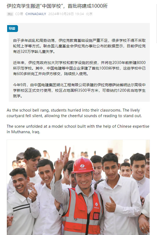 近日,《中国日版》报道了湖北工程公司承建的伊拉克示范学校(穆萨纳省)学校项目。 该项目是伊拉克政府2030年前新建8000所学校计划中的首批项目和中伊合作框架下实施的首个项目,也是中伊共建“一带一路”的重要民生工程,具有重要的社会经济意义,对当地教育发展与改革至关重要。项目建成后,将成为质量标准高、风格现代化并符合伊拉克切实需求的示范性学校项目,显著改善相关地区教育设施状况和教学条件,对于提升伊拉克整体教育水平具有重大意义。 中国电建承担679所学校项目的建设任务,分别分布在伊拉克中南部10个省,其中湖北工程公司负责穆萨纳省53所学校的施工任务。 报道链接:https://mp.weixin.qq.com/s/CgwWbXgSwuY55Kv8dPX4pA?nwr_flag=1#wechat_redirect |
